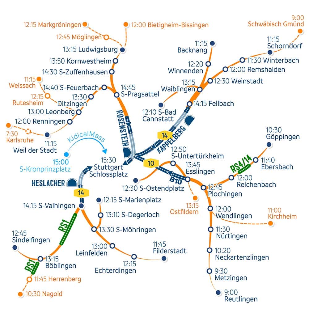 Weiter geht es über Leinfelden, Möhringen und Vaihingen. Ein Highlight wird die Fahrt über die B14 und durch den Heslacher Tunnel zum Schlossplatz. Aktuelle Informationen gibt es auf https://fildern.adfc.de .