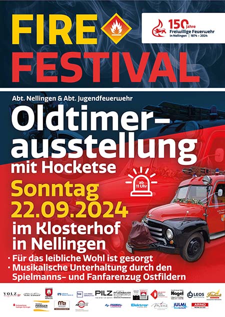 Wir freuen uns auf einen wunderbaren Tag mit zahlreichen Besuchern, viel Freude an den historischen Fahrzeugen und einem abwechslungsreichen Rahmenprogramm im Zeichen des 150-jährigen Bestehens der Freiwilligen Feuerwehr Ostfildern, Abteilung Nellingen. Seien Sie dabei und lassen Sie sich dieses besondere Ereignis des FireFestivals nicht entgehen!