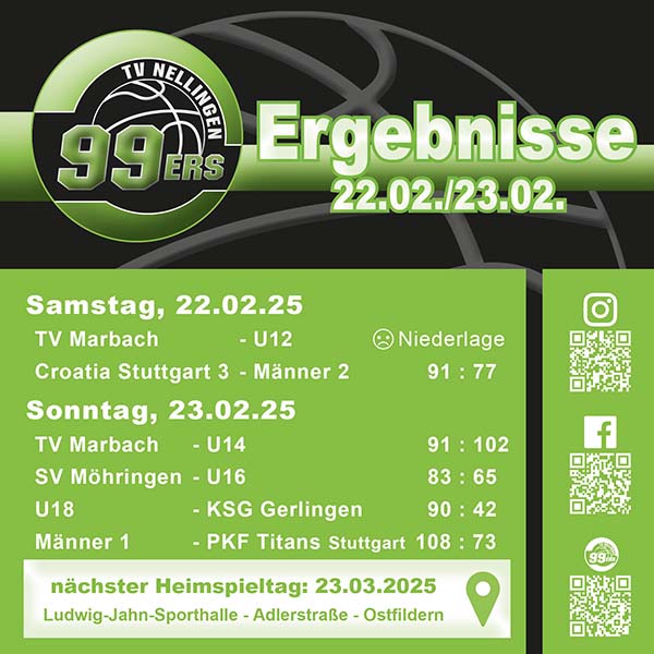 Die U12 der 99ers zeigte am Samstag großen Kampfgeist, gegen stark aufspielende Marbacher war diesmal jedoch leider nichts zu holen. Doch die Revanche ließ nicht lange auf sich warten! Die U14 nahm den Fehdehandschuh auf und sorgte mit einem verdienten Sieg gegen Marbach am Sonntag für Wiedergutmachung. Auch die U16 lieferte einen echten Krimi: Gegen den Tabellenführer SV Möhringen zeigte das Team eine kämpferische Glanzleistung und verlangte dem Favoriten alles ab – auch wenn es am Ende nicht ganz reichte. Die Herren 2 standen ebenfalls auswärts vor einer Sensation, forderten den Tabellenführer Croatia Stuttgart bis zur letzten Minute – doch mussten sich leider auch die 99ers am Ende knapp geschlagen geben. Am Sonntag brannte die Ludwig-Jahn-Halle dann lichterloh! Zunächst ließ die U18 den Gästen vom KSG Gerlingen keine Chance und feierte einen deutlichen Heimsieg. Und dann war es soweit: Die Herren 1 krönten sich mit einer überragenden Performance gegen die PKF Titans aus Stuttgart vorzeitig zum Meister! Ein perfektes Finale für ein packendes Basketball-Wochenende!