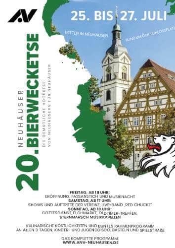 Am letzten Wochenende vor den Sommerferien steht wieder das große Gemeindefest in Neuhausen an, die traditionelle Neuhäuser Bierwecketse – das Fest der Neuhäuser Vereine auf dem Schloßplatz. „Diese Bierwecketse ist eine ganz besondere, nämlich die 20. Bierwecketse. Vor 44 Jahren, im Juli 1991, veranstalteten die Vereine unter der Regie der Arbeitsgemeinschaft Neuhäuser Vereine (ANV) erstmals die Bierwecketse. Seitdem findet sie üblicherweise im Zwei-Jahres-Rhythmus statt und hat sich zu einer echten Erfolgsgeschichte entwickelt“, erklärte Hans Bayer, Vorsitzender der Arbeitsgemeinschaft Neuhäuser Vereine (ANV). „Natürlich haben wir uns für diese Jubiläumsbierwecketse ein paar Highlights ausgedacht“, so Hans Bayer weiter.