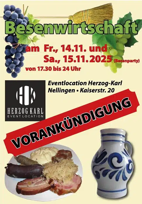 In gemütlicher Atmosphäre lädt die Fußballabteilung des TV Nellingen Mitte November wieder zu ihrer beliebten Besenwirtschaft in den Herzog-Karl ein. An zwei Abenden verwandelt sich die Vereinsgaststätte in ein herbstlich geschmücktes Besenstüble, in dem Geselligkeit, gute Gespräche und kulinarische Genüsse im Mittelpunkt stehen.
