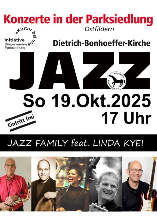 Am Sonntag, 19. Oktober 2025 um 17 Uhr lädt die Initiative Bürgerverein Parksiedlung zu einem besonderen Konzert in die Dietrich-Bonhoeffer-Kirche Ostfildern ein. Unter dem Motto „Konzerte in der Parksiedlung“ gastiert die JAZZ FAMILY feat. Linda Kyei und bringt mitreißende Jazzklänge auf die Bühne. Der Eintritt ist frei – ein ideales Event für Musikliebhaber und alle,