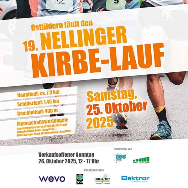 Am Samstag, 25. Oktober 2025 findet in Ostfildern der 19. Nellinger Kirbe-Lauf statt. Angeboten werden der Hauptlauf (ca. 7,3 km), ein Schülerlauf (1,45 km) sowie ein Bambinilauf (400 m). Außerdem gibt es spannende Mannschaftswertungen. Am darauffolgenden verkaufsoffenen Sonntag, 26. Oktober 2025, sind die Geschäfte von 12 bis 17 Uhr geöffnet.