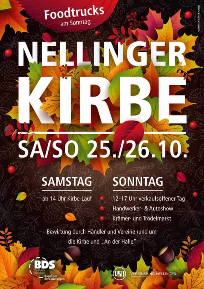 Die Nellinger Kirbe lädt am Samstag, 25. Oktober, und Sonntag, 26. Oktober, zu einem bunten Herbstwochenende ein. Am Samstag startet ab 14 Uhr der Kirbe-Lauf, begleitet von Bewirtung durch Händler und Vereine rund um die Kirbe und „An der Halle“. Am Sonntag geht es von 12 bis 17 Uhr mit einem verkaufsoffenen Tag weiter. Zusätzlich