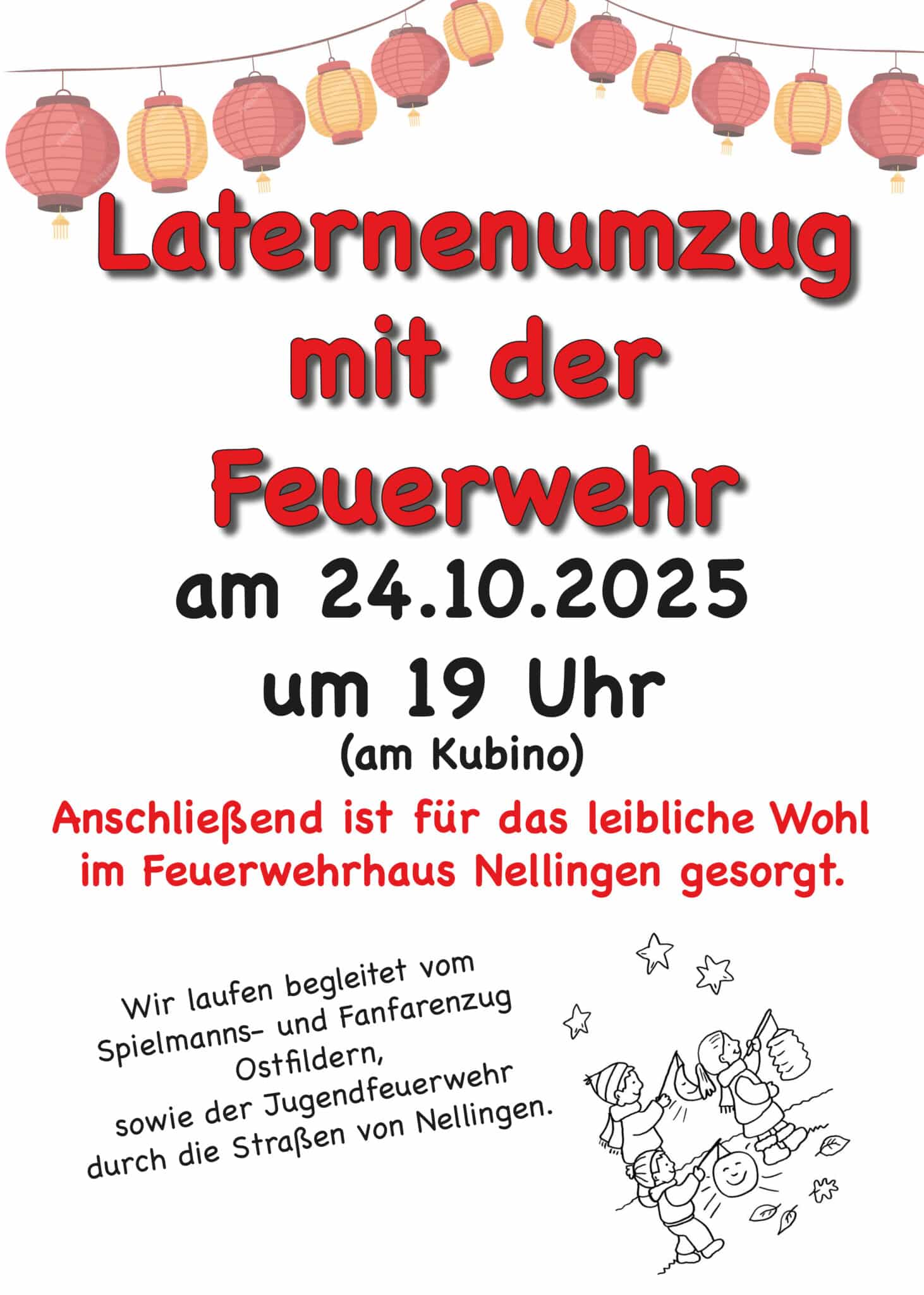 Am 24. Oktober 2025 findet in Nellingen ein stimmungsvoller Laternenumzug mit der Feuerwehr statt. Start ist um 19 Uhr am Kubino. Gemeinsam mit dem Spielmanns- und Fanfarenzug Ostfildern sowie der Jugendfeuerwehr ziehen die Teilnehmenden durch die Straßen von Nellingen. Im Anschluss lädt die Feuerwehr ins Feuerwehrhaus Nellingen ein, wo für das leibliche Wohl bestens gesorgt