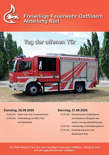 Tag der offenen Tür – Feuerwehr Ostfildern, Abteilung Ruit Am Samstag, 20. September 2025, lädt die Freiwillige Feuerwehr Ostfildern, Abteilung Ruit, gemeinsam mit der Jugendfeuerwehr zum Tag der offenen Tür ein. Ab 15:00 Uhr geselliges Beisammensein („Hock“) rund ums Feuerwehrhaus Ab 19:00 Uhr Unterhaltung mit der Band RED FOX und Barbetrieb Am Sonntag, 21. September